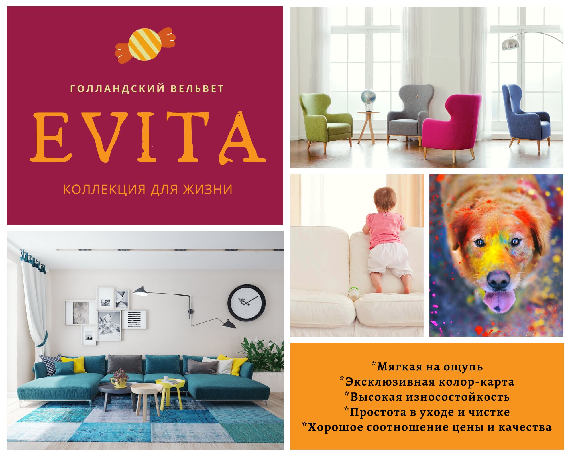 Имя Эвита образовано от древнееврейского имени Хава (Ева), которое в различных вариантах означает «дыхание», «жизнь». Коллекция однотонного голландского вельвета Эвита призвана вдохнуть жизнь в интерьер своей сбалансированной палитрой оттенков. Широкий выбор оттенков одно из главных преимуществ коллекции. От пастельных до ярких, глубоких и классических цветов. Мягкая и нежная на ощупь фактура коллекции сочетает в себе высокие эксплуатационные качества. Благодаря специальной обработки сырья, материал голландский вельвет имеет хорошую эластичность и цветоустойчивость. Высокая износостойкость и устойчивость к механическим повреждениям, позволяет использовать коллекцию в коммерческих целях – 60 000 циклов Мартиндейла.