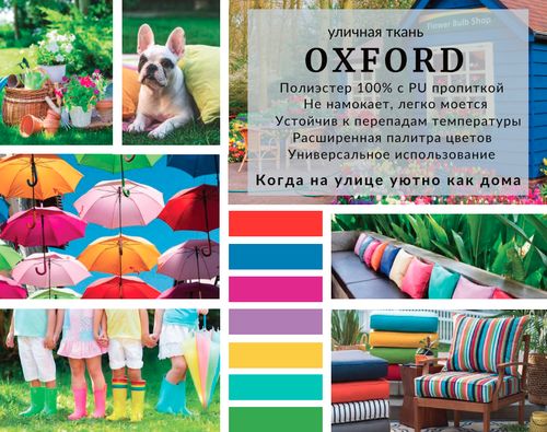 Сделайте свой уют уникальным В английском Оксфорде с погодой не всегда гладко и его символом вполне может стать яркий зонтик на сером дождливом фоне. А вот коллекция универсальныx материалов Oxford как раз полная противоположность своему городу побратиму, хотя и его символом вполне может стать яркий симпатичный зонт. Дело в том, что уникальный по своим свойствам материал Oxford – это легкая, прочная, долговечная и удобная в работе ткань на основе модифицированного полиэстера с полиуретановой пропиткой. Она как зонтик благодаря мембране отталкивает влагу при этом обладает «дышащими свойствами». Именно благодаря своим техническим характеристикам: влагостойкости, прочности, устойчивости к линьке и пиллингу, невероятной стойкости на разрыв, ткань Oxford приобрела небывалую популярность во многих отраслях промышленности. Сейчас можно с уверенностью сказать, что области применения универсальной ткани Oxford весьма разнообразны: интерьерная и уличная мебель, разного рода тенты и навесы, туристическое снаряжение, сумки, коляски, верхняя одежда и обувь, а также многое и многое другое. Влагоотталкивающий материал. Защищает от дождя. Термостойкий. Выдерживает перепады температур от -50 до +110 градусов, защищает от холода и жары. Не пропускает холодный воздух. Защищает от ветра. Грязеотталкивающий. Любые пятна легко отмываются. Долговечный. OXFORD 600D не подвержен линьке, пилинга, истиранию. Прочный. Не рвется, не расходится по шву. Простой в уходе. Ткань легко чистится, при правильной сушке не мнется.